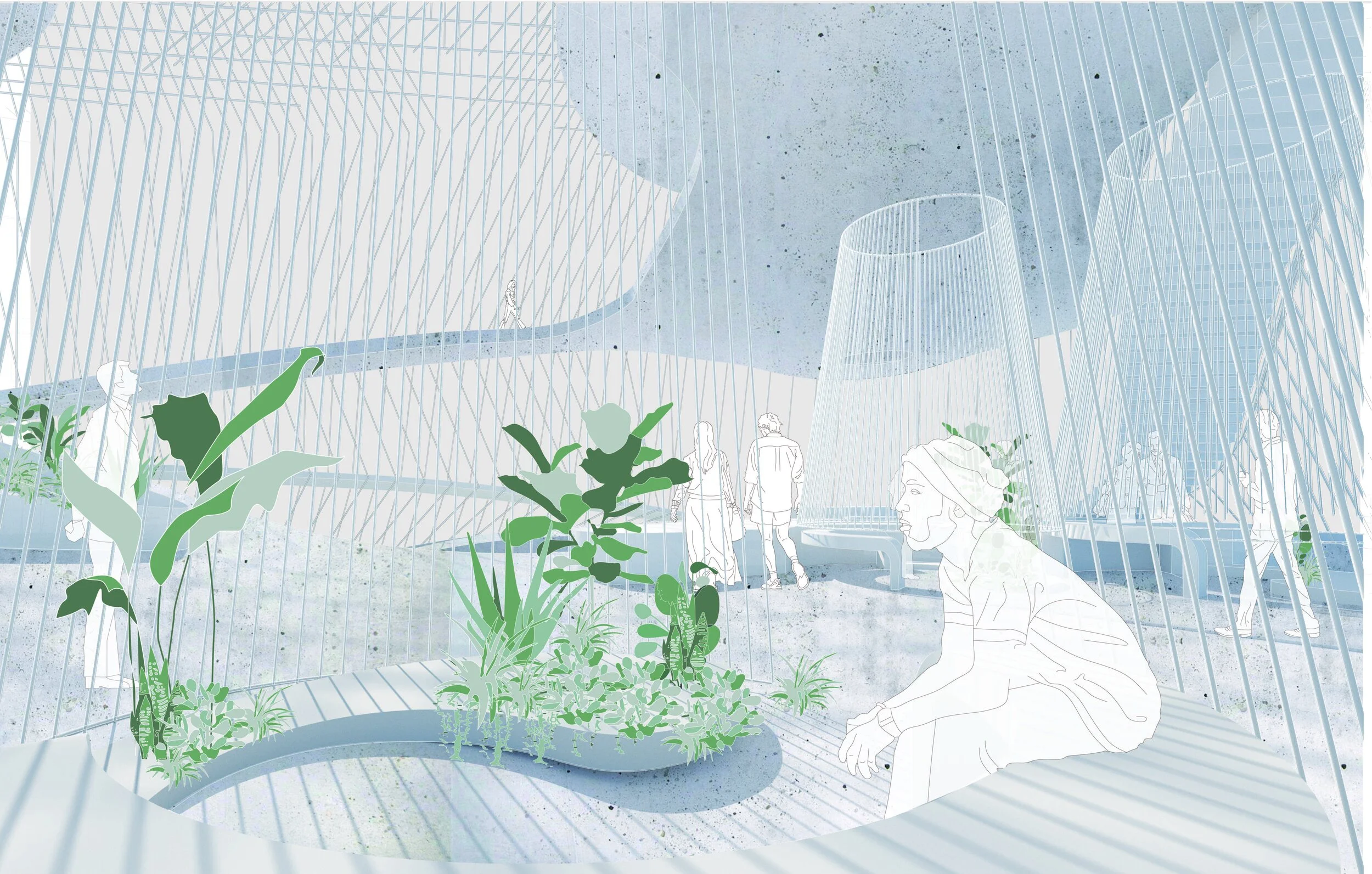 Water Memory Botanical Archive celebrates the dualities of life and death, where they coexist in multiple scales. A collection of structures is calibrated to house three primary functions: a chapel and bio-cremation space, a spiraling garden, and recreation space. These functions are networked through circulations that interlace a field of pockets of repose, from intimate to large gathering spaces. The concept of this archive lends itself to the idea of the meandering promenade that each individual experiences through different stages in life.